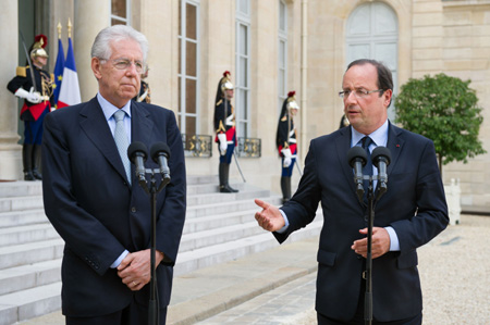 法国总统弗朗索瓦·奥朗德与意大利总理马里奥·蒙蒂7月31日在巴黎会晤后发表联合声明说,法意两国在根本上与欧元区完整性紧密相连,决心采取一切措施捍卫欧元区。 声明说,为此,欧元区成员国和欧盟机构将根据赋予的权利履行各自义务,以维持欧元区和欧洲金融市场的稳定和正常运作。相关各方应尽快落实上月底欧盟夏季峰会达成的协议,在需要的情况下,在最短的时间内启动和利用协议承诺的机制和工具。 图为奥朗德(右)与蒙蒂共同出席新闻发布会。