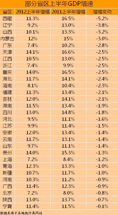 截至8月1日,除甘肃和黑龙江省之外,全国已有29个省(自治区、直辖市)份公布了2012年上半年GDP(国内生产总值)增速。与2011年上半年相比,29个省份的GDP增速均出现了放缓。其中,西藏增幅下降最大,降幅达5.2个百分点。