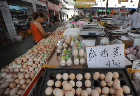据新华社全国农副产品和农资价格行情系统监测数据显示,8月11日,普通鲜鸡蛋全国日均价较7月21日价格上涨7.3%,较6月11日价格仅低0.4%。 图为8月12日,记者在成都市一家市场看到,售卖价格最高的藏鸡蛋为20元一斤,普通鲜鸡蛋最低为4.7元一斤。
