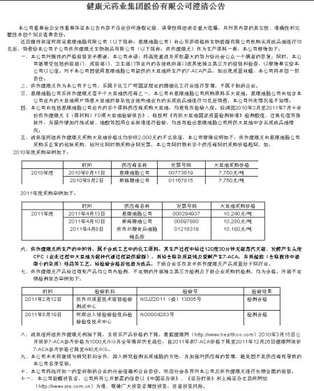 一、本公司对媒体的严格监督表示感谢,本公司承诺:将高度重视并采取最大的努力给社会公众一个满意的答复;同时,本公司愿接受包括药监部门、质监部门、卫生部门等在内的各级政府部门或其他独立第三方的监督和检查,以澄清事实给本公司以公道。对于本公司因使用惠康油脂公司提供的大豆油所生产的7-ACA产品,如出现质量问题,本公司将承担一切责任。