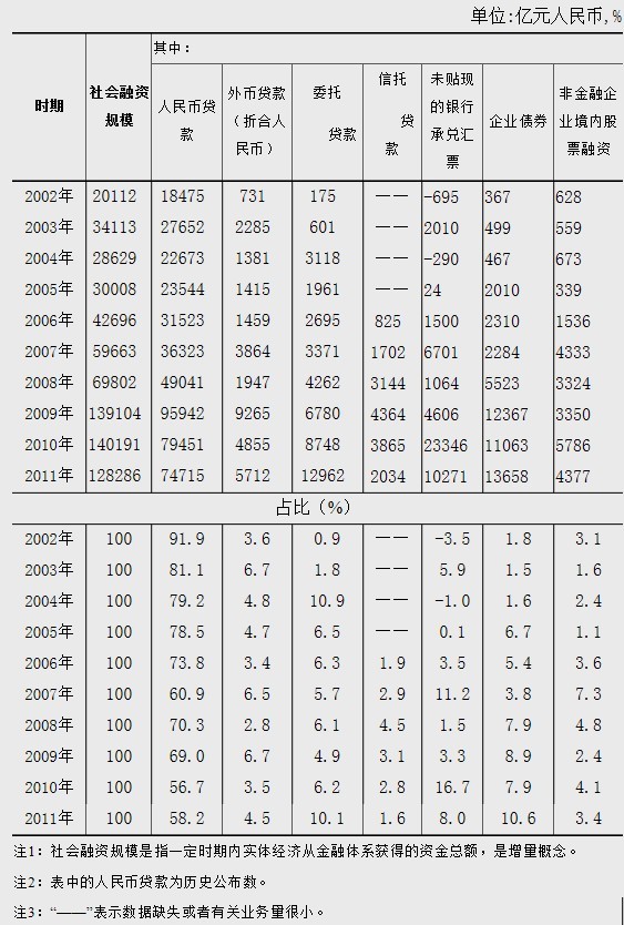 金融结构呈现多元发展,金融对资源配置的积极作用不断提高。一是人民币贷款占比显著下降,人民币贷款外的其他方式融资数量和占比明显上升。2011年新增人民币贷款7.47万亿元,是2002年的4.04倍;除人民币贷款外的其他方式融资为5.36万亿元,是2002年的32.7倍,占同期社会融资规模的41.8%,比2002年上升33.7个百分点。二是直接融资快速发展,市场配置资金的作用不断提高。2011年企业债券和非金融企业境内股票合计融资1.80万亿元,是2002年的18.1倍;合计占同期社会融资规模的14.0%,比2002年提高9.1个百分点。三是金融机构表外业务融资功能显著增强。2011年实体经济通过未贴现的银行承兑汇票、委托贷款和信托贷款从金融体系融资合计达2.53万亿元,而在2002年这些金融工具的融资量还非常小。四是非银行金融机构对实体经济的支持力度迅速加大。2011年小额贷款公司新增贷款1934亿元,比2009年增长1.5倍,相当于一家中型股份制商业银行一年的新增贷款规模。
