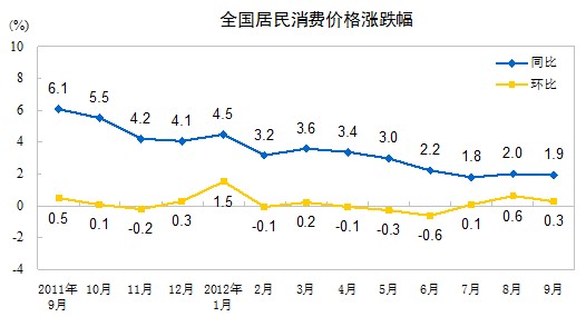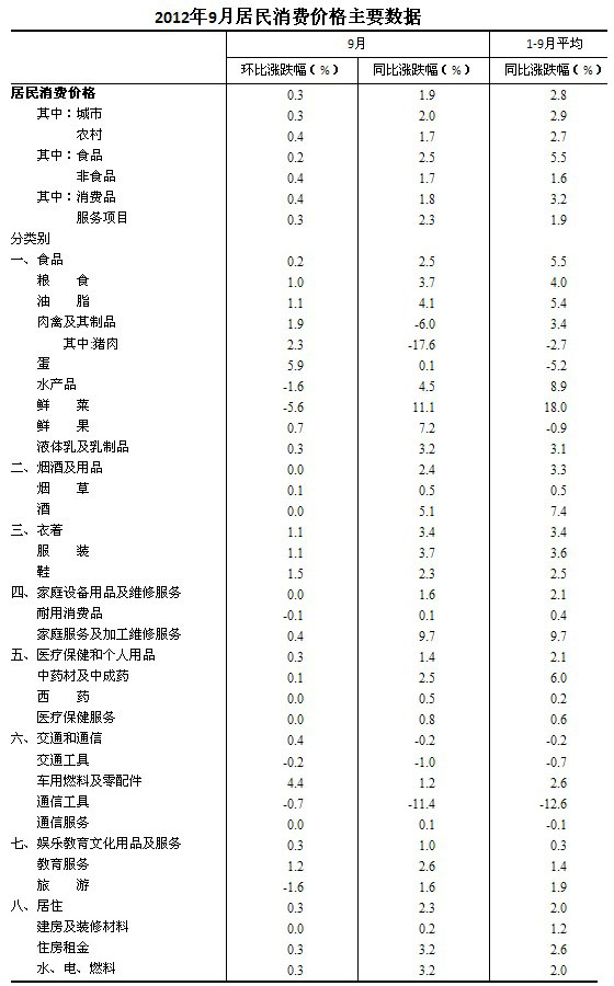2012年9月份,全国居民消费价格总水平同比上涨1.9%。其中,城市上涨2.0%,农村上涨1.7%;食品价格上涨2.5%,非食品价格上涨1.7%;消费品价格上涨1.8%,服务项目价格上涨2.3%。1-9月平均,全国居民消费价格总水平比去年同期上涨2.8%。