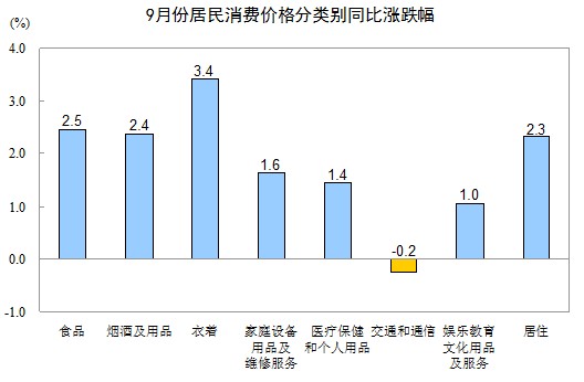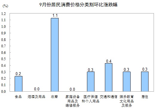 9月份,全国居民消费价格总水平环比上涨0.3%。其中,城市上涨0.3%,农村上涨0.4%;食品价格上涨0.2%,非食品价格上涨0.4%;消费品价格上涨0.4%,服务项目价格上涨0.3%。