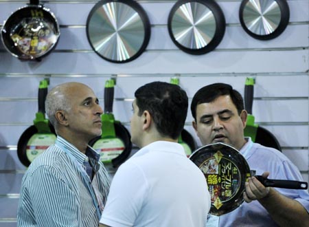 第112届广交会二期于10月27日闭幕。来自大会的数据显示,本届到会采购商比上届同期下降11.38%,成交总体情况不容乐观。图为采购商在广交会二期的一个厨具展位参观。