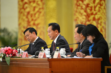 11月7日,中国共产党第十八次全国代表大会新闻中心在北京举行首次新闻发布会。这是大会新闻发言人蔡名照(左二)在介绍情况。 蔡名照在回答记者提问时说,今年以来,面对复杂严峻的国内外环境,我们坚持稳中求进的工作总基调,加强和改善宏观调控,特别是5月份以来出台了一系列预调微调的政策措施,对增强市场信心、促进经济企稳发挥了积极作用。