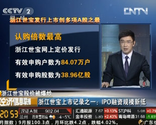 经观黄利明:今日,浙江世宝上市首日涨幅已520.15%,券商估平均价4.85元,现股价却已飙至16元。其港股昨日收盘2.72港元(合人民币2.19元)。今天又发盈利预测——全年净利润降30%,测算今年每股收益为0.285元,其市盈率已达57倍,但中小板平均市盈率为30倍,以此测算极限的合理价也仅为8.55。可怜的小散,被忽悠。