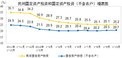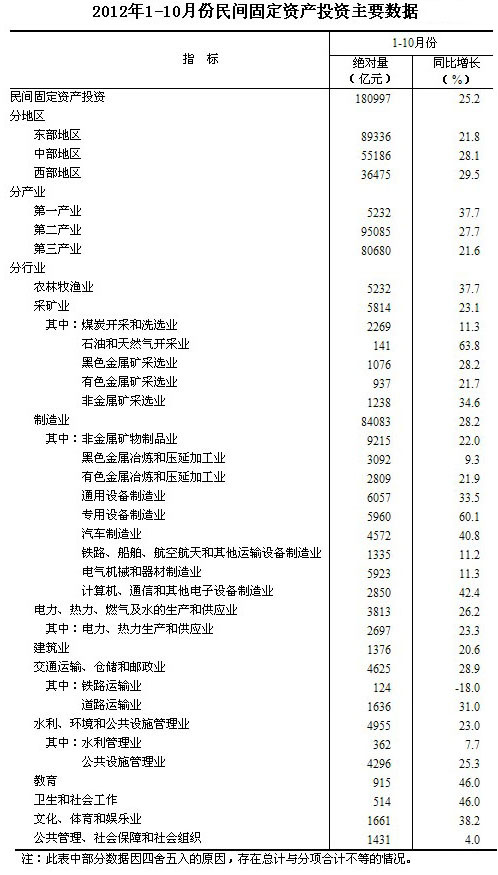 2012年1-10月份,全国民间固定资产投资180997亿元,同比名义增长25.2%,增速比1-9月份加快0.1个百分点。民间固定资产投资占固定资产投资的比重为61.9%,比1-9月份下降0.1个百分点。