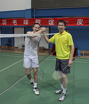 受格兰富中国公司邀请,丹麦前羽毛球世界冠军彼得盖德日前来到北京,与球友进行了一次小规模的羽球交流活动。 盖德与林丹、陶菲克、李宗伟并称世界羽毛球界四大天王,这次来到北京,他还与大家一起交流打球心得,并分享了自己的得分经验。 8日盖德将作为特邀嘉宾与丹麦王储腓特烈及王储妃玛丽殿下一道,出席在丹麦使馆举办的“ 2012 年我的丹麦足迹活动” 。届时,在华数家丹麦企业高管及企业社会责任负责人出席此次活动,畅谈中丹合作体会并作出展望。