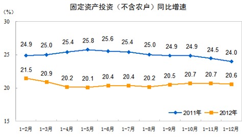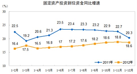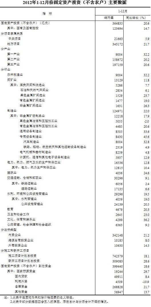 2012年1-12月份,全国固定资产投资(不含农户)364835亿元,同比名义增长20.6%(扣除价格因素实际增长19.3%),增速比1-11月份回落0.1个百分点,比2011年回落3.4个百分点。从环比看,12月份固定资产投资(不含农户)增长1.53%。