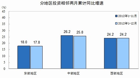 分地区看,1-12月份,东部地区投资169939亿元,同比增长17.8%,增速比1-11月份回落0.2个百分点;中部地区投资103713亿元,增长25.8%,增速回落0.4个百分点;西部地区投资86150亿元,增长24.2%,增速与1-11月份持平。