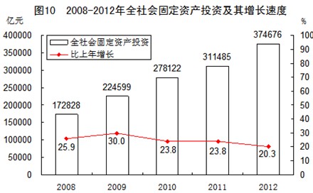 全年全社会固定资产投资374676亿元,比上年增长20.3%,扣除价格因素,实际增长19.0%。其中,固定资产投资(不含农户)364835亿元,增长20.6%;农户投资9841亿元,增长8.3%。东部地区投资[10]151742亿元,比上年增长16.5%;中部地区投资87909亿元,增长24.1%;西部地区投资88749亿元,增长23.1%;东北地区投资41243亿元,增长26.3%。