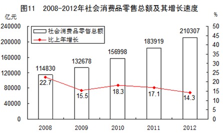 全年社会消费品零售总额210307亿元,比上年增长14.3%,扣除价格因素,实际增长12.1%。按经营地统计,城镇消费品零售额182414亿元,增长14.3%;乡村消费品零售额27893亿元,增长14.5%。按消费形态统计,商品零售额186859亿元,增长14.4%;餐饮收入额23448亿元,增长13.6%。