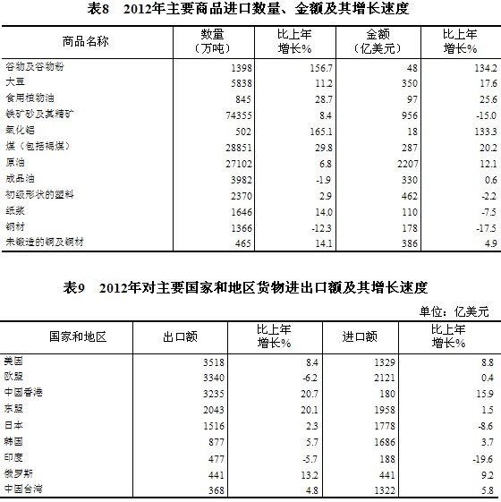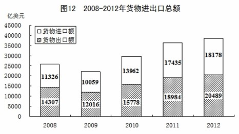 全年货物进出口总额38668亿美元,比上年增长6.2%。其中,出口20489亿美元,增长7.9%;进口18178亿美元,增长4.3%。进出口差额(出口减进口)2311亿美元,比上年增加762亿美元。
