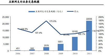 大多数银行业内人士认为,互联网支付市场正在对传统的银行支付业务构成威胁。数据显示,2012年互联网交易的总金额为38412亿元,同比增长70.46%,占全年社会消费品零售总额20.72万亿元的18.54%。