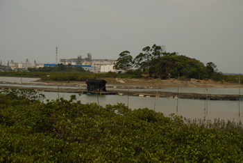 透过红树林向北眺望,一排白色油罐与几个高耸的烟囱映入眼帘,这就是中石油广西石化。记者