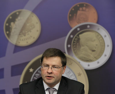 图为拉脱维亚总理东布罗夫斯基斯当日在比利时首都布鲁塞尔的欧盟总部出席加入欧元区的新闻发布会。