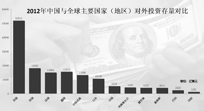 据统计,截至2012年底,中国对外直接投资累计净额(存量)达5319.4亿美元,位居全球第13位。