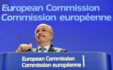 欧盟4日对8家金融机构开出创纪录的17亿欧元罚单,因为这些金融机构操纵了欧洲银行间欧元同业拆借利率和日元东京银行间同业拆借利率。其中,德意志银行因涉嫌操纵这两种利率被开出最大罚单,为7.25亿欧元。图为欧盟负责竞争事务的委员华金·阿尔穆尼亚在4日的发布会上发言。