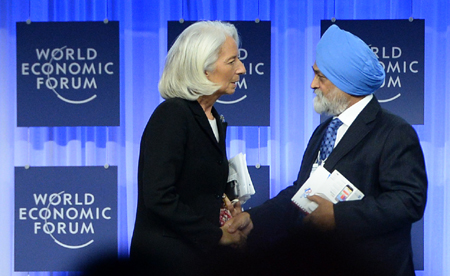国际货币基金组织(IMF)总干事拉加德在瑞士达沃斯年会上说,面对美联储政策调整,不同新兴经济体受到的影响不尽相同。有些国家几乎没有出现资本外流,而有些国家则出现了大规模的资本流动。她说,市场和投资者将根据经济基本面、政府实力、政策决策来决定资金流向。 图为1月25日,在达沃斯年会会议中心,拉加德(左)与印度计划委员会副主席蒙特克·辛格·阿卢瓦利亚在出席关于全球经济展望的讨论会时握手。