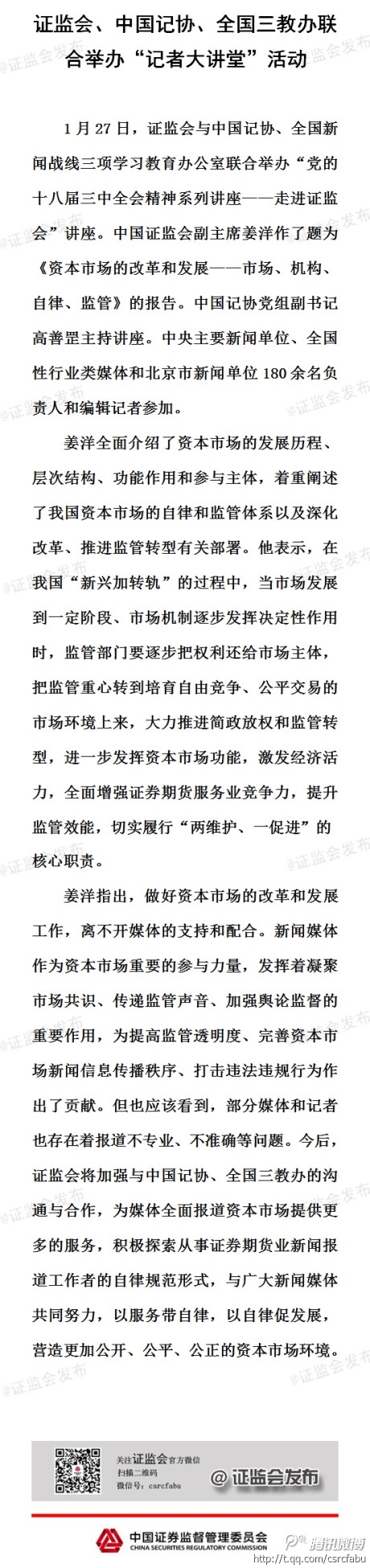 据证监会微博消息,1月27日,证监会、中国记协、全国三教办联合举办“记者大讲堂”活动,证监会副主席姜洋表示,证监会将加强与中国记协、全国三教办的沟通和合作,为媒体全面报道资本市场提供更多服务,积极探索从事证券期货业新闻报道工作者的自律规范形式,与广大新闻媒体共同努力,以服务带自律,以自律促发展,营造更加公开、公平、公正的资本市场环境。