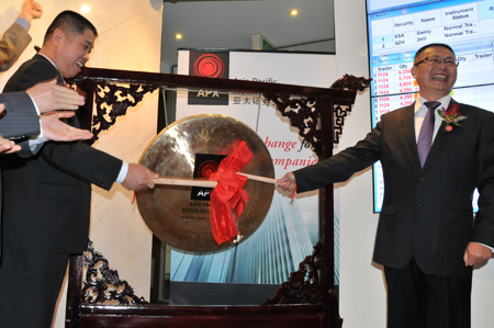 3月6日,澳大利亚生命力控股集团董事长陈良超(右)与中环运控股集团董事长曹友共同敲锣,宣布两家公司在亚太证交所上市。 当日,澳大利亚亚太证券交易所在悉尼举行敲锣仪式,两家中资背景的公司也于当日在这里正式挂牌上市,标志着这家由华人金融企业全资持有的证交所正式开始运行。