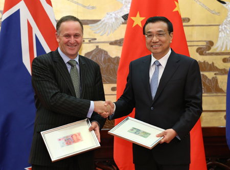 3月18日,国务院总理李克强在北京人民大会堂同来华进行工作访问的新西兰总理约翰·基举行会谈。这是会谈后,两国总理共同出席人民币与新西兰元直接交易的宣布仪式。中国人民银行表示,开展人民币对新西兰元直接交易,有利于形成人民币对新西兰元直接汇率,降低经济主体汇兑成本,促进人民币与新西兰元在双边贸易和投资中的使用,有利于中新之间不断发展的经济金融关系。