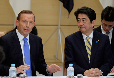 澳大利亚和日本7日在东京就自由贸易协定达成一致。澳大利亚成为首个与日本达成贸易协定的农业出口国家。据悉,日本已同意将澳大利亚牛肉进口关税由38.5%缩减至一半;澳大利亚基本同意停止对日本收取5%的汽车进口关税。日澳双方将于今年夏天签订相关协议,为其在2015年生效铺平道路。图为7日澳大利亚总理阿博特(左)与日本首相安倍晋三在日本东京举行高级别会谈。