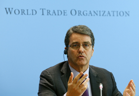 图为WTO总干事阿泽维多在新闻发布会上。