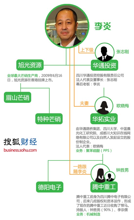 有关李炎的失踪还引出了另一条线索,即包括腾中重工在内的所谓“华通系”。有传闻称,包括德阳化工、德阳电子、旭光高新在内的多家企业均由李炎实际控制。其中,腾中重工部分资产遭法院查封,德阳化工停产,而旭光资源则在香港市场停牌,因其财务遭机构举报涉嫌造假。昨天下午,旭光高新公告称,公司与董事长张志刚保持联系,而张志刚也与大股东索郎多吉(即李炎)取得联系,后者称一切正常。