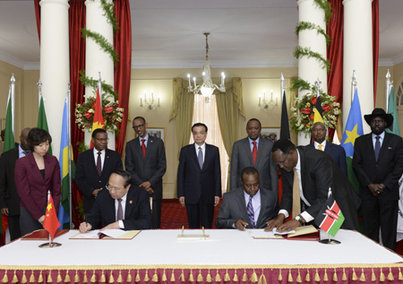 5月11日,国务院总理李克强在内罗毕和肯尼亚总统肯雅塔、乌干达总统穆塞维尼、南苏丹总统基尔、卢旺达总统卡加梅,以及坦桑尼亚、布隆迪的总统代表共同见证中国肯尼亚关于蒙巴萨-内罗毕铁路建设相关合作文件签署。