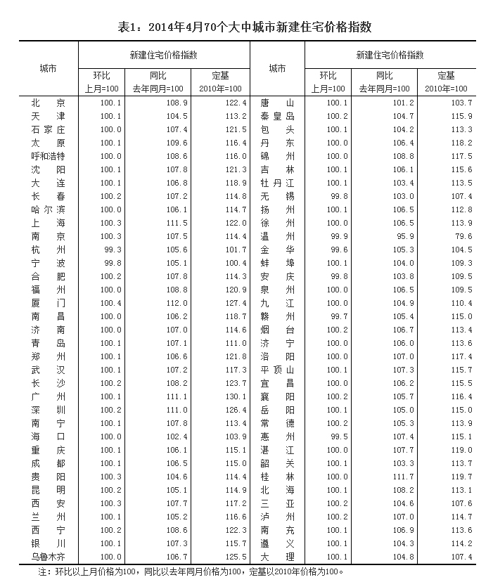 (二)与去年同月相比,70个大中城市中,价格下降的城市有1个,上涨的城市有69个。4月份,同比价格变动中,最高涨幅为13.6%,最低为下降4.4%。