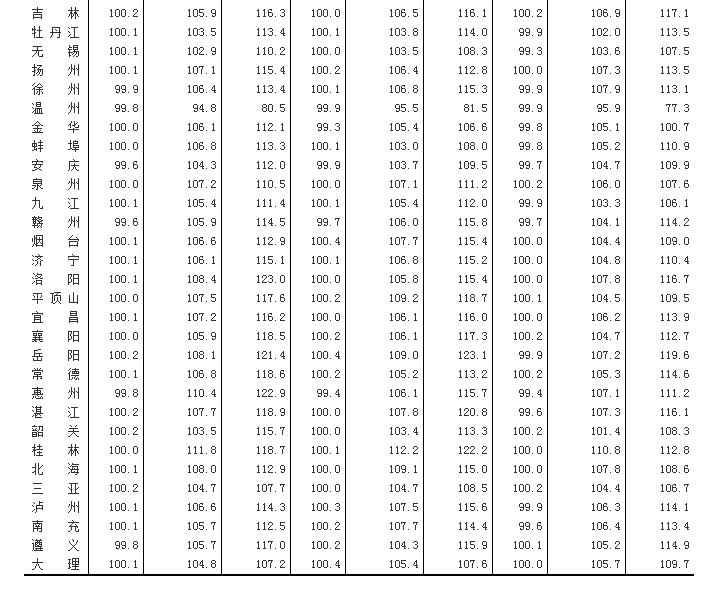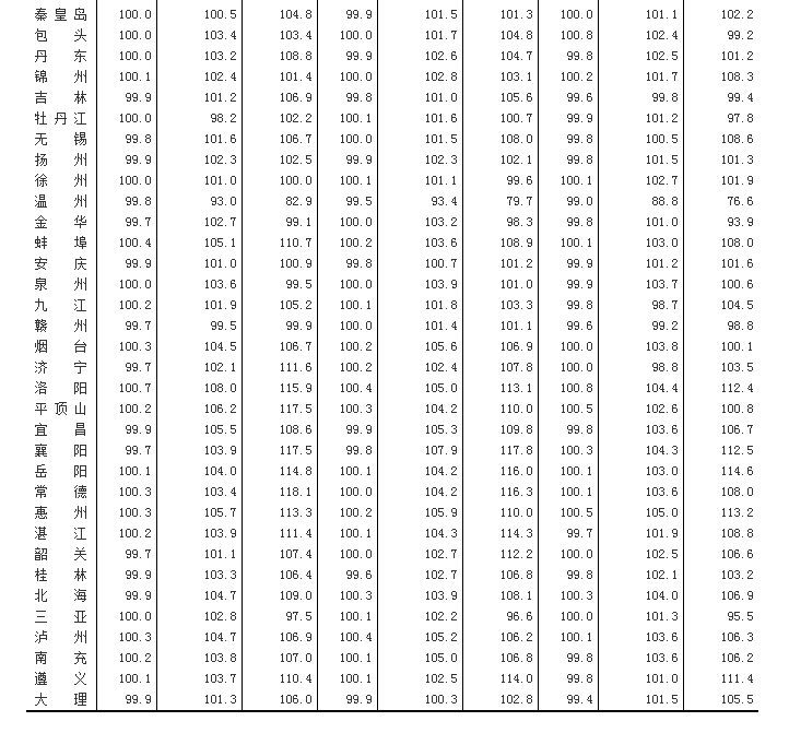 (一)与上月相比,70个大中城市中,价格下降的城市有8个,持平的城市有18个,上涨的城市有44个。环比价格变动中,最高涨幅为0.4%,最低为下降0.7%。