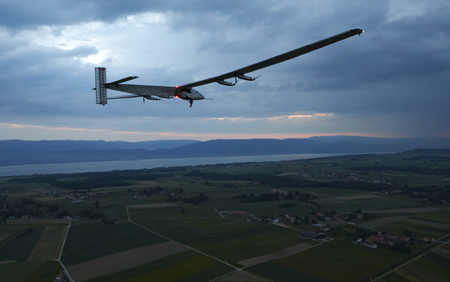 6月2日,目前全球最大的太阳能飞机“太阳驱动”2号在瑞士西部城市帕耶讷成功首飞。明年3月,两名瑞士探险家将驾驶“太阳驱动”2号从海湾地区出发,经阿拉伯海,进入印度、缅甸、中国,然后跨越太平洋前往美国,再飞往南欧和北非,最终回到起点。 图为当日在帕耶讷进行首飞的太阳能飞机“太阳驱动”2号。