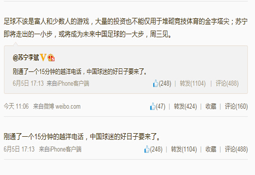 消息面,传闻称苏宁即将牵手国外豪门俱乐部巴萨,进军足球行业。今日苏宁云商(002024)副总裁、运营总部执行总裁李斌发布相关微博表示,“足球不该是富人和少数人的游戏,大量的投资也不能仅用于堆砌竞技体育的金字塔尖;苏宁即将走出的一小步,或将成为未来中国足球的一大步,周三见”。同时,有网友发现,地铁站到处充满着巴萨球星宣传画,结果是苏宁广告。