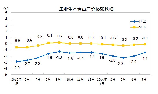 2014年5月份,全国工业生产者出厂价格同比下降1.4%,环比下降0.1%。工业生产者购进价格同比下降1.8%,环比下降0.1%。1-5月平均,工业生产者出厂价格同比下降1.9%,工业生产者购进价格同比下降2.1%。