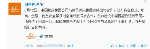 6月12日,中国邮政集团公司与阿里巴巴集团达成战略合作。双方将在物流、电商、金融、信息安全等领域全面开展深度合作,合力建设中国智能物流骨干网。通过这个网络平台,邮政覆盖全国超十万个网点将与菜鸟网络全面打通,并开放给社会化物流。