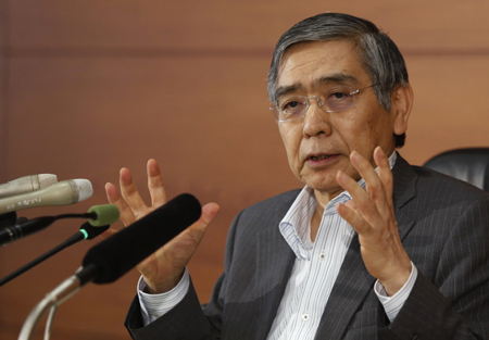 日本央行近日在经过两天的政策会议后表示,虽然消费税上涨对实体经济产生了一定程度的损伤,但总体来说日本经济正走在温和复苏的轨道中。日本央行将继续维持现在每年购买60万亿至70万亿日元资产的货币宽松政策不变,并维持对该国经济“持续显现温和复苏态势”的基本评估。 图为日本央行行长黑田东彦在新闻发布会上回答提问。