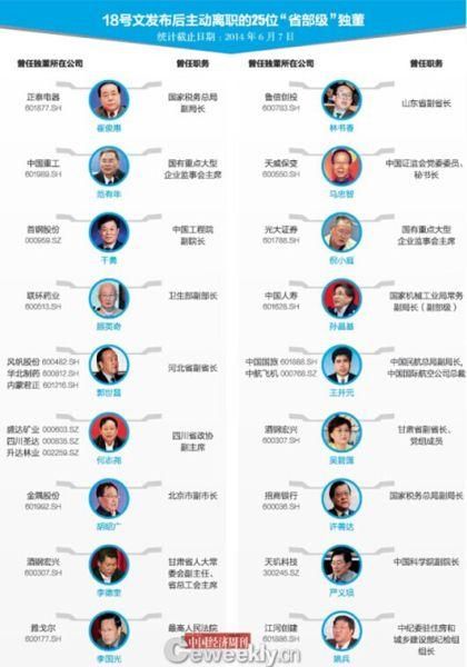 《中国经济周刊》记者梳理统计,从2013年10月19日至2014年6月7日,其间共有25位“省部级”独董离任,涉及31家上市公司。