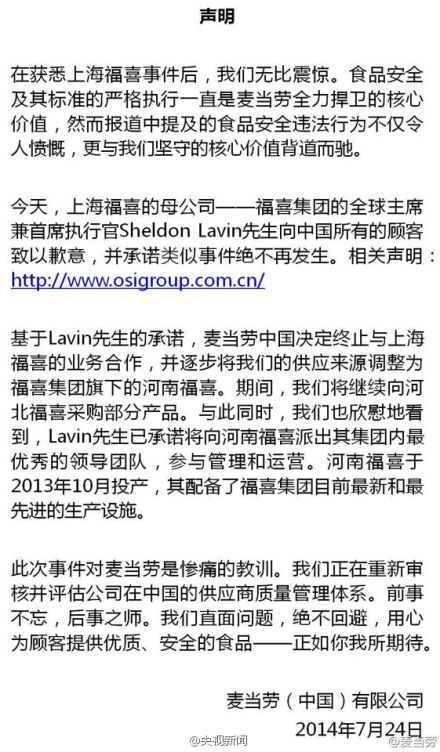 @央视新闻:#麦当劳肯德基供应商被曝光#【麦当劳终止与上海福喜的合作】@麦当劳 今晨发布声明称,上海福喜母公司福喜集团全球主席兼首席执行官向中国所有顾客致歉,并承诺类似事件绝不发生。基于其承诺,麦当劳中国决定终止与上海福喜的业务合作,并将供应来源调整为福喜旗下的河南福喜。(央视记者陈雯 王殿甲)