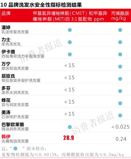 第三方权威检测机构检测结果发现,在安全性方面,韩伊洗发水当中的两种防腐剂——甲基异噻唑啉酮(MIT)和甲基氯异噻唑啉酮(CMIT)复配物含量为28.9ug/g,超标近两倍,可能易引发过敏;同时并检出可能致癌物丙烯酰胺,疑似添加了业内早已淘汰的增稠剂。