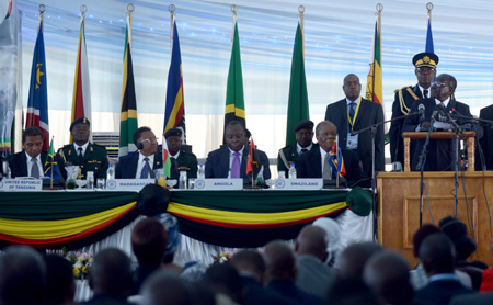 第34届南部非洲发展共同体(南共体)首脑峰会于17至18日在津巴布韦维多利亚瀑布城举行,主题为南共体经济转型策略。非洲自由贸易区的谈判进程是备受瞩目的议题。南共体执行秘书斯特格米娜·塔克斯表示,非洲自由贸易区可能比计划提前一年即在2015年建立。这一大自贸区建成后将覆盖东南非共同市场、东非共同体和南共体共26个成员国,惠及非洲大陆6亿人口,国内生产总值总计约1万亿美元。 图为17日津巴布韦总统穆加贝(前右一)在南部非洲发展共同体峰会上发言。