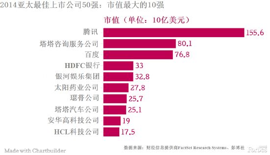 报道称,科技公司在中国上榜公司中一马当先。榜单上市值最高的是腾讯,为1,556亿美元,差不多是排名第二的塔塔咨询服务公司(Tata