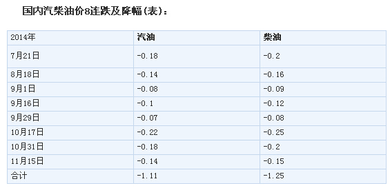 国家发展改革委14日发出通知,决定将汽、柴油价格每吨分别降低190元和180元,测算到零售价格90号汽油和0号柴油(全国平均)每升分别降低0.14元和0.15元,调价执行时间为11月14日24时。