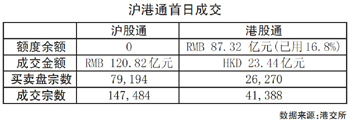 沪港通启动首日,早盘截至10:00,沪股通买入71.94亿元,卖出0亿元,使用额度约71.94亿元,剩余额度48.06亿元。港股通买入8.54亿元,卖出0.11亿元,使用额度约7.81亿元,剩余额度97.19亿元。截至下午16时,沪股通买入120.82亿元,卖出0亿元;报进买单未成交但未撤单的占了9.18亿元;合计使用额度130亿元,剩余额度0亿元,触及单日额度限制。港股通买入22.38亿港元(人民币17.73亿元),卖出1.06亿港元(人民币0.84亿元),使用额度17.673亿元,剩余额度87.327亿元。