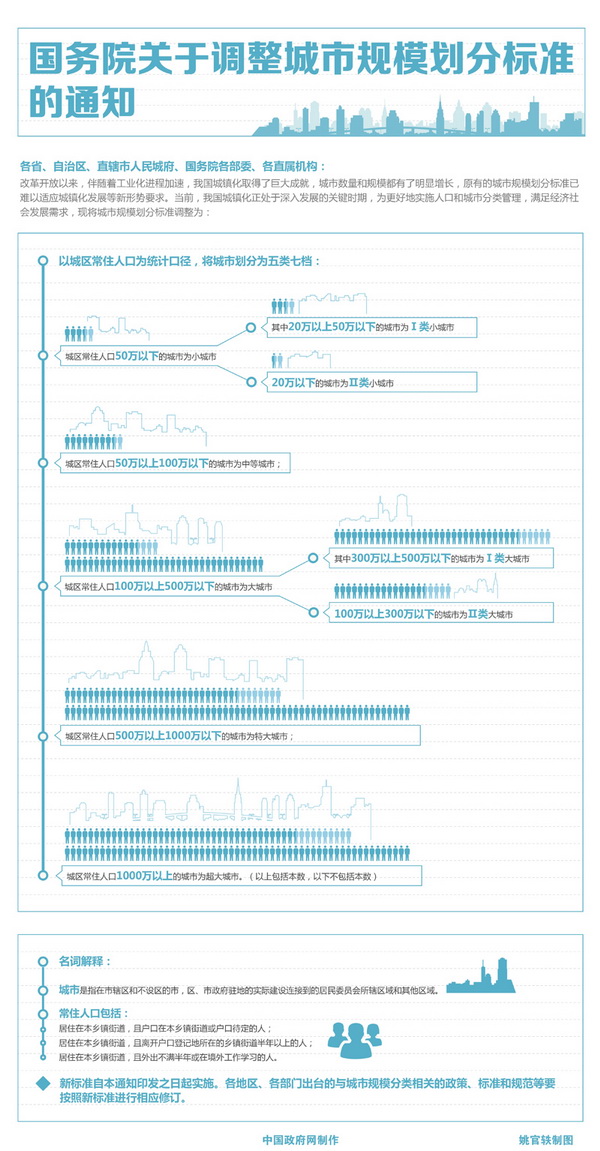 国务院通知指出,各地区、各部门出台的与城市规模分类相关的政策、标准和规范等要按照新标准进行相应修订。