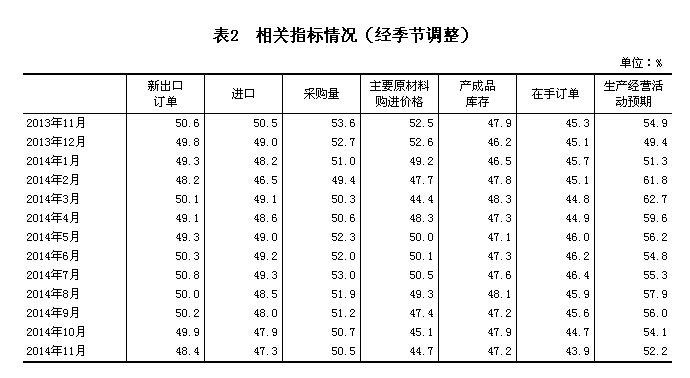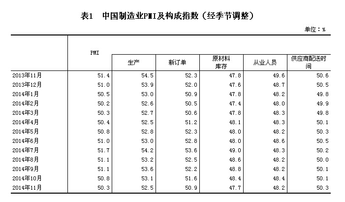 2014年11月,中国制造业采购经理指数(PMI)为50.3%,比上月回落0.5个百分点,但继续高于临界点,表明我国制造业总体上仍保持扩张态势。