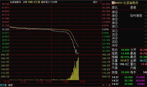 12月18日午后,比亚迪港股突然暴跌40%,并且引发A股连锁反应,盘中一度触及跌停板。截至14:50,比亚迪A股报收37.01元,下跌8.57。有市场传闻系巴菲特拟大举减持。记者第一时间致电公司,比亚迪方面回应,公司现在一切正常,没有任何突发事件,对巴菲特减持传闻并不知晓。