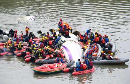 2月4日,救援人员在台北市基隆河河面搜救。 2月4日上午,台湾复兴航空一架从台北飞往金门的ATR-72班机在台北市南港失联并坠河。机上共有58人,截至4日22时,台湾复兴航空班机事故共寻获40人,送医15人,死亡25人。旅客中有大陆乘客31名,其中已知6人罹难,3人受伤。