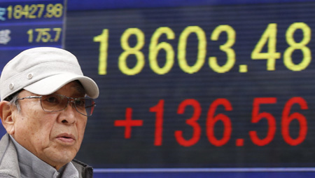 2月24日,一名男子经过日本东京街头的股指显示牌。 受日元持续小幅贬值等积极因素提振,24日东京股市连续第五个交易日收高,日经225种股票平均价格指数在收盘时比前一交易日上涨0.74%,再次刷新近15年最高纪录。
