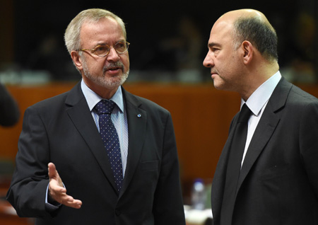 欧盟各国财长10日就一项3150亿欧元的投资计划细节达成一致。这项计划接着将递交给欧洲议会,寻求批准后才能生效。该计划旨在重振欧洲经济,为期四年。各国财长希望今年就能启动第一批投资项目。 图为当日在比利时首都布鲁塞尔,欧洲投资银行行长维尔纳·霍耶(左)与欧盟委员会负责经济和金融事务的委员皮埃尔·莫斯科维奇出席欧盟经济及财政事务理事会会议。